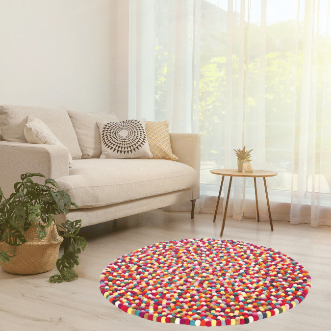 Enhance your living spaces with our beautifully handcrafted felt ball rugs. Perfect for living rooms, bedrooms, nurseries, kids’ playrooms, and even offices, these round wool rugs offer both comfort and safety while adding a touch of elegant decor. Each Himalayan Aesthetics rug is made with love and care by skilled women artisans, using premium New Zealand wool. Your purchase directly contributes to their empowerment and helps improve their livelihoods.