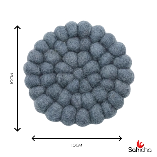 Sahi Cha Eco-Friendly Wool Felt Ball Coasters. Handcrafted by skilled women using 100% natural wool, these coasters are not only durable but also beautifully designed. Each coaster is made from individually hand-felted wool balls, sewn (not glued) for lasting quality and an eco-friendly touch. Perfect for protecting your surfaces from spills and heat, these colorful coasters also add a striking decorative element to your living spaces. Pair them with our matching wool trivets for a coordinated look, or gift them to someone special for any occasion.